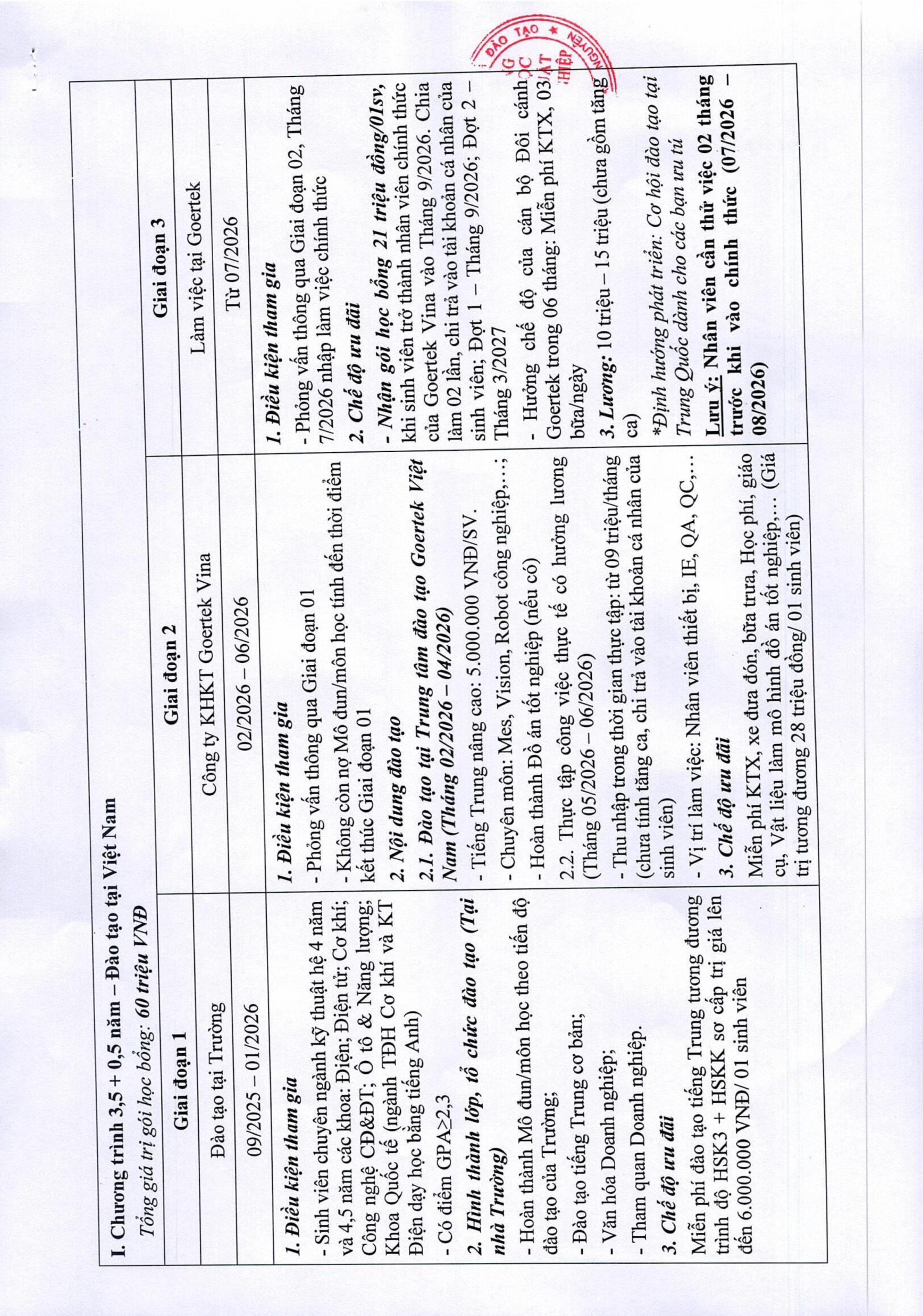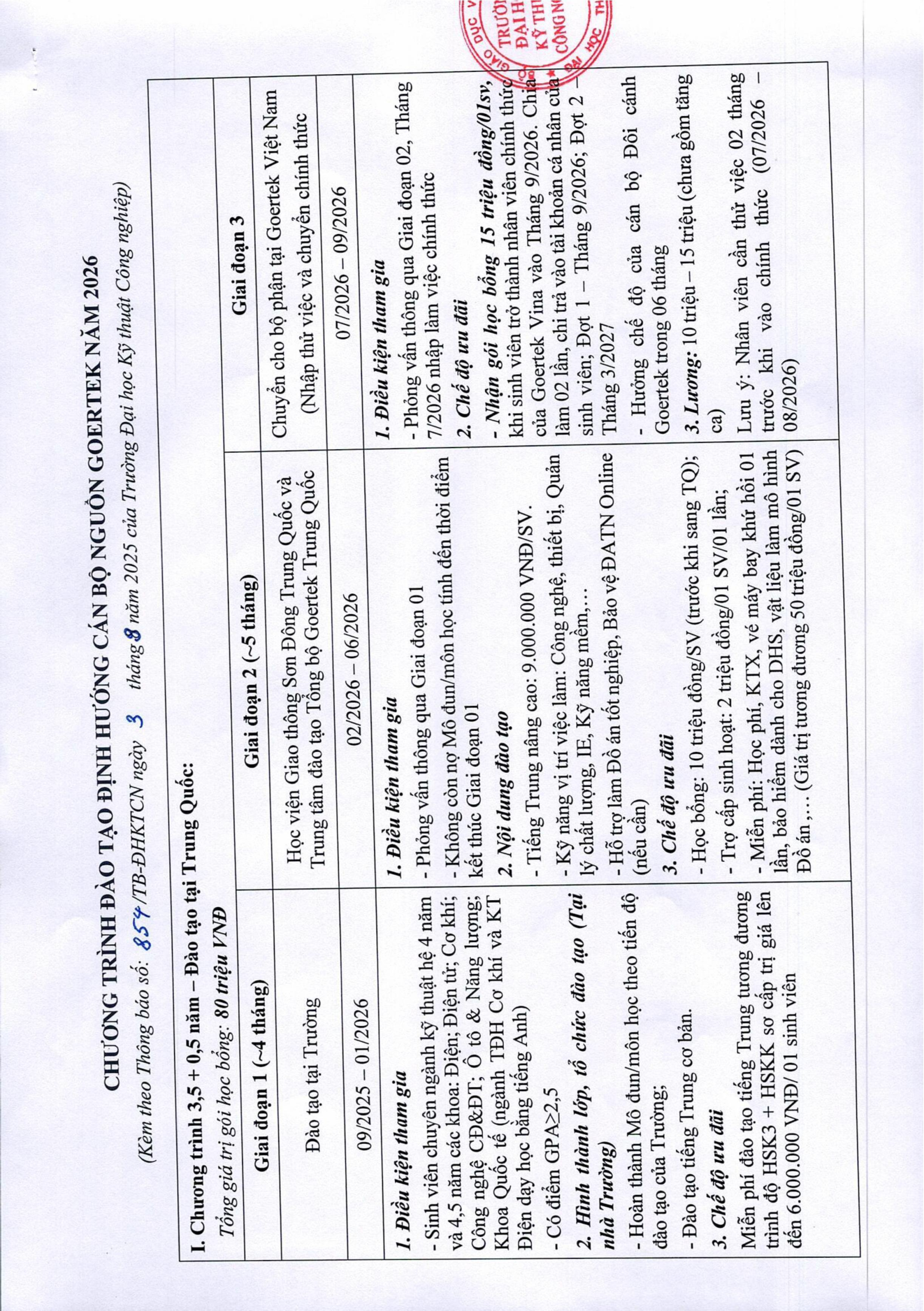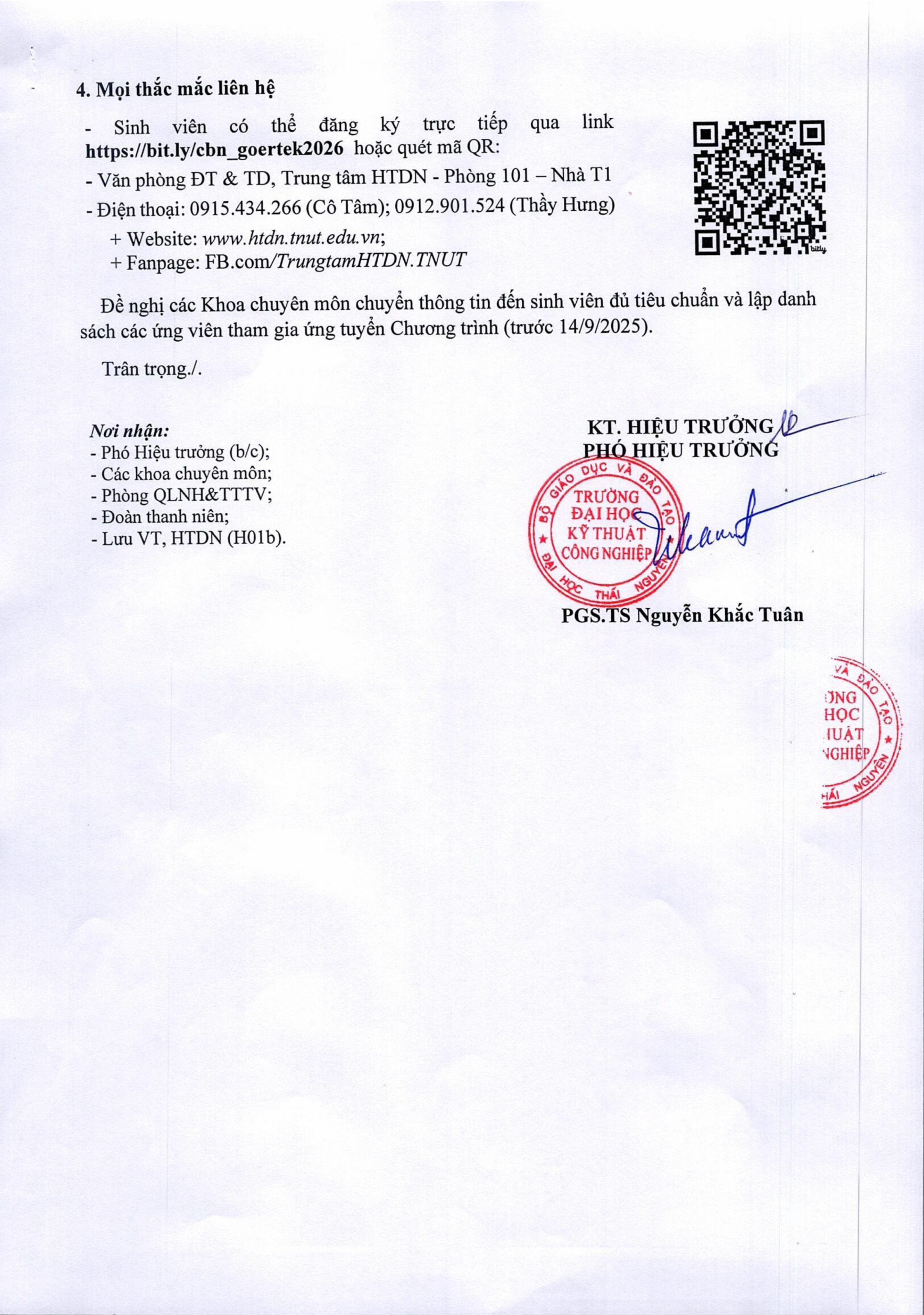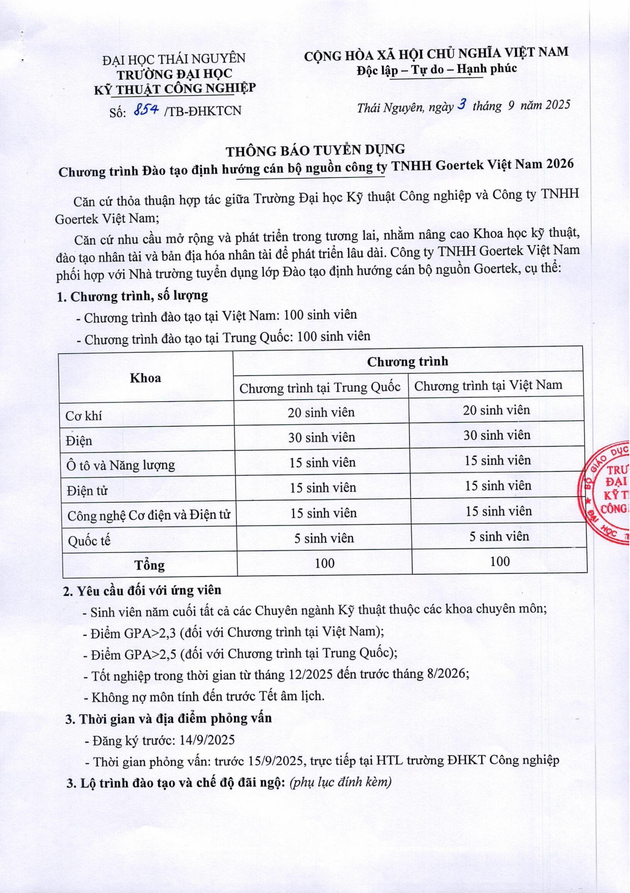 Thực hiện chương trình hợp tác trong đào tạo và giới thiệu việc làm cho sinh viên giữa TNUT và công ty TNHH Goertek Việt Nam năm 2026. Trường Đại học Kỹ thuật thông báo tuyển dụng chương trình đào tạo định hướng cán bộ nguồn của công ty TNHH Goertek Việt Nam năm 2026 cho sinh viên từ năm 3 tại TNUT đợt tháng 9 năm 2025.